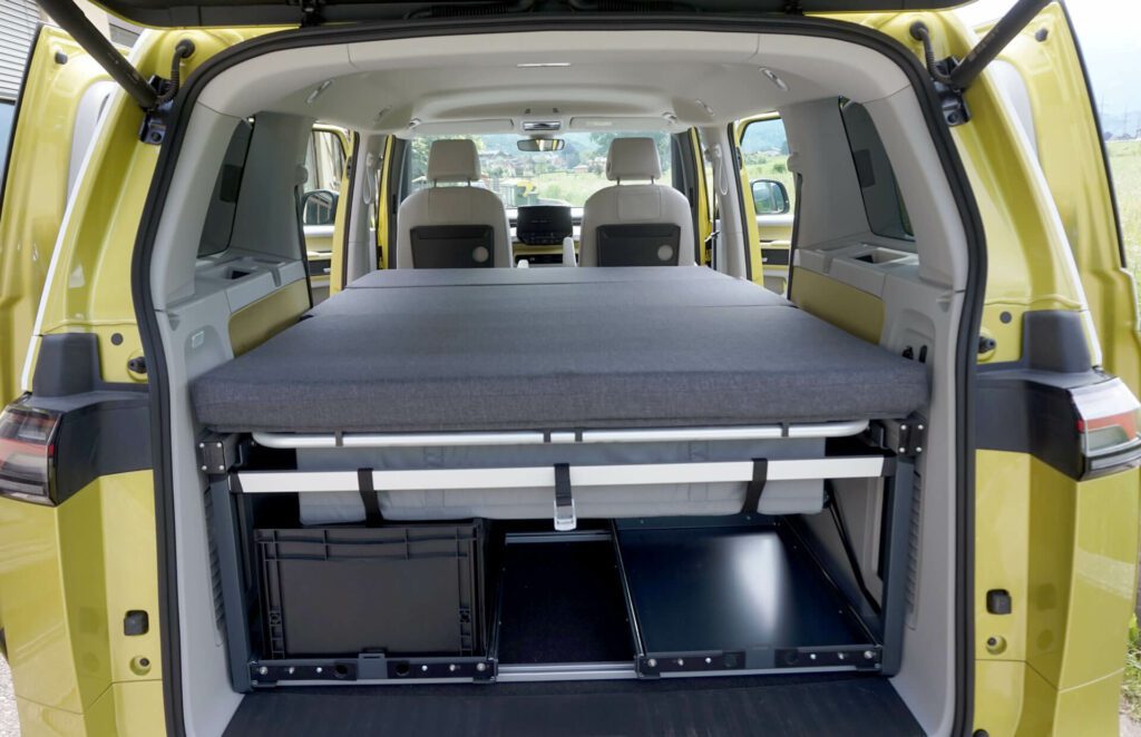 Das FRED Schlafsystem mit bequemer Matratze ist dank dem Platten-Lattenrost steht's gut belüftet und hat eine integrierte Sofa-Lounge-Funktion. Optional kann der Campingausbau mit einer Kofferraum-Tasche oder einer Küche erweitert werden. Um den Stauraum unter dem Bett optimal zu nutzen können bis zu zwei Auszüge für Euroboxen nachgerüstet werden. Perfekt angepasst ist das FRED Bettsystem für viele Fahrzeuge, vom Mini-Van, Hochdachkombi bis Van, Bus und Kastenwagen geeignet.